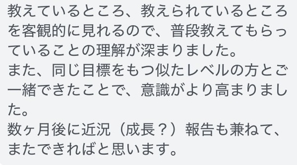 また、同じ目標をもつ似たレベルの方とご一緒できたことで、意識がより高まりました