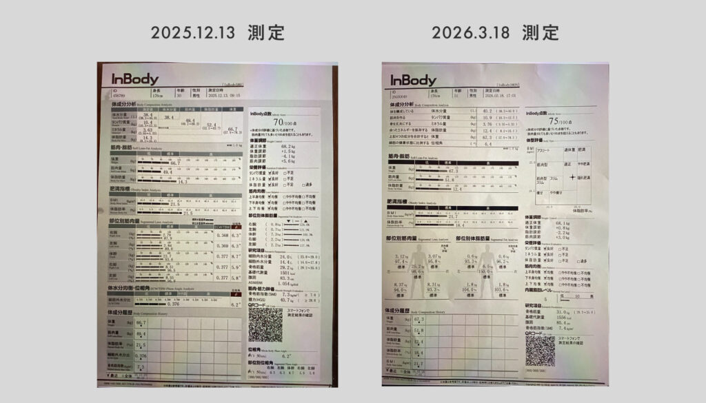 結果として、約2kgの除脂肪に成功し、1.5kgの筋肥大という効果を数字で実感することができました。