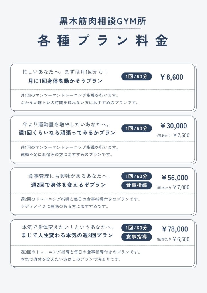 | サービス | 週2回のトレーニング指導+食事指導 |